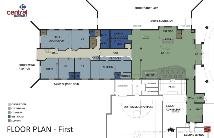 God is blessing Central Ministries in an amazing way!  In the last four years, the church has grown in weekend attendance of approximately 500 people to close to 1,000.  Central Christian School (which meets on Central’s campus) is also at its all-time high enrollment with over 150 students (K thru 8th) attending the school in the fall.  This growth has led to a few “good problems” like the need for space.  So, after researching, praying and designing for the last two years, the leadership has a strategy for a master plan for the next several years.  It is divided up into three different phases.